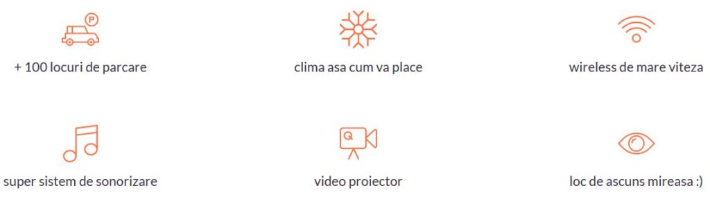 In sala ai la dispozitie, o receptie de primire, wi-fi, aer conditionat, sonorizare, video proiector, flipchart-uri, iar afara peste 100 locuri de parcare.