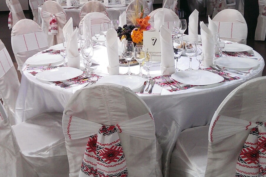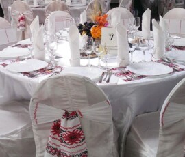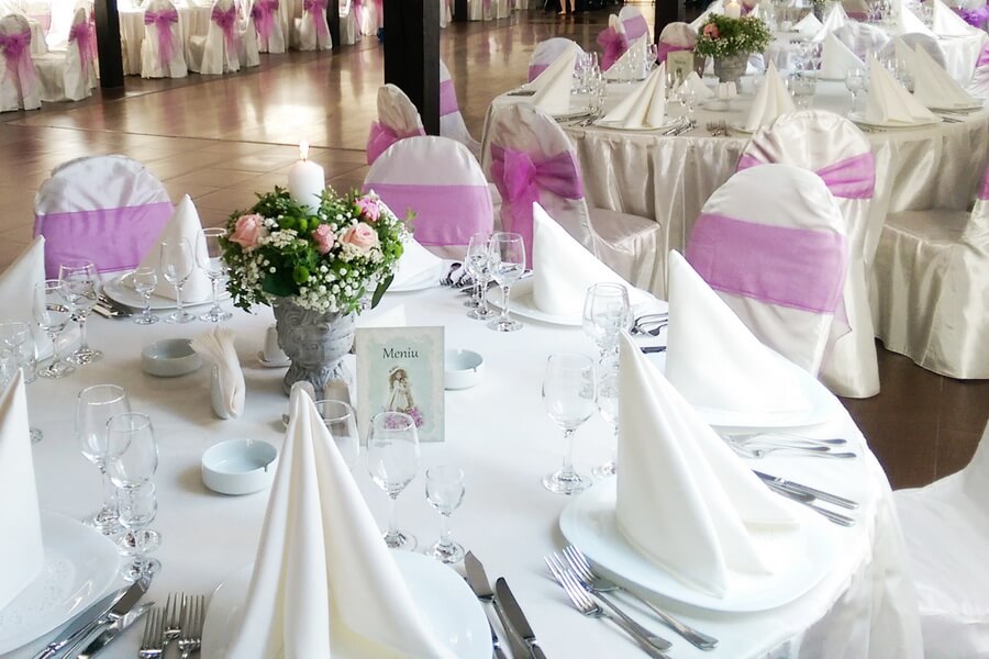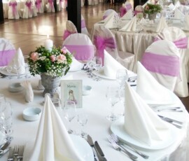 Sala, mesele si scaunele le puteti decora cum vreti, pe orice tema, cu noi sau cu orice alta firma specializata pe care o doriti.